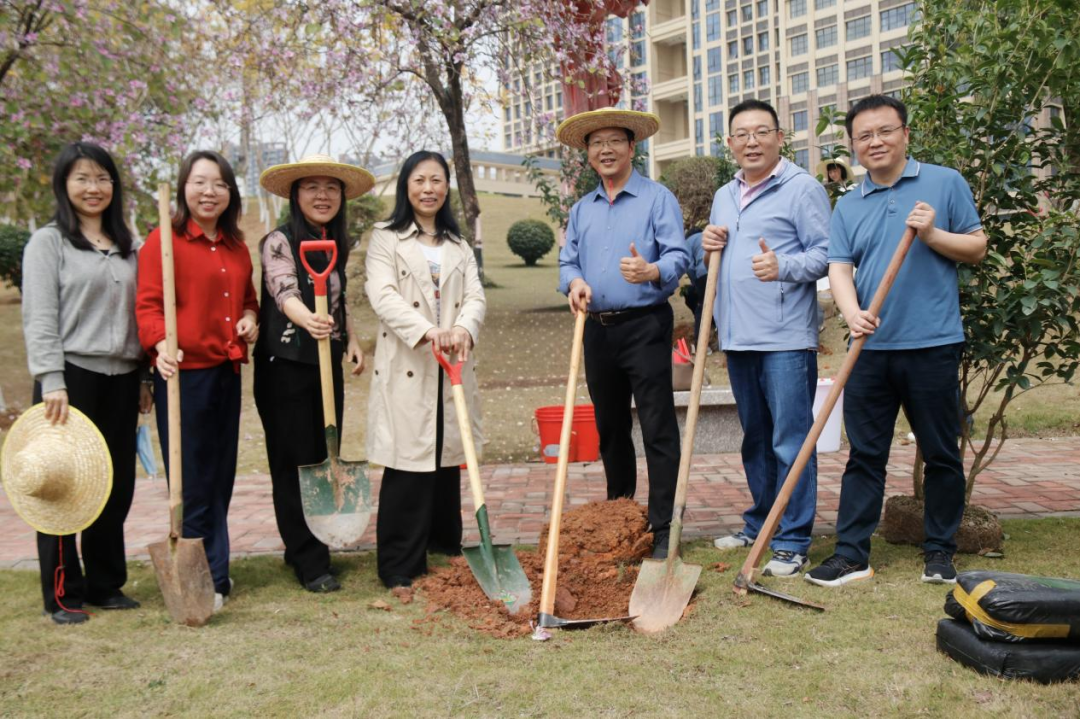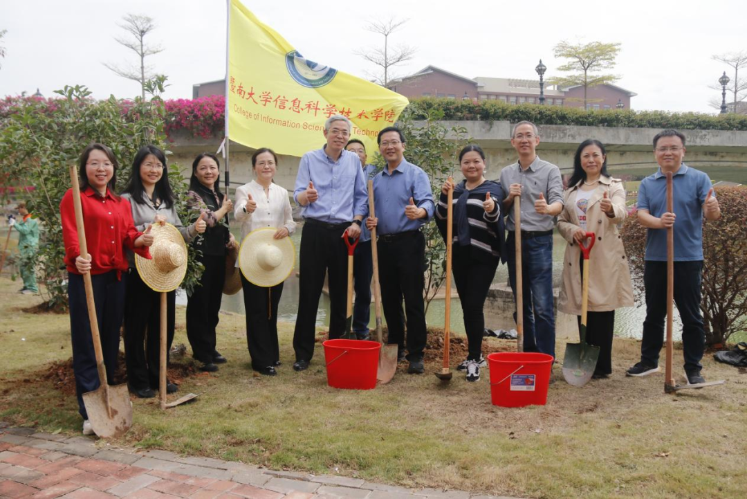 植此青绿之际,万物竞萌之时,2025年3月12日上午,在第47个植树节来临之际,暨南大学信息科学技术学院为深入贯彻落实党的二十届三中全会精神和生态文明思想,践行以人为本的环境育人理念,积极响应暨南大学番禺校区植树美化校园号召,开展了“手植春光,向绿而行”的主题植树活动。学院院长李哲涛、党委书记罗国伟、党委副书记张艳丽、党政办主任李琰、研管办主任赵承想、电子工程系党总支书记张磊、数学系党总支书记褚志娟、计算机科学系党总支书记彭盼、学工办主任江秀海等及本科生、研究生同学们一同参加了活动。