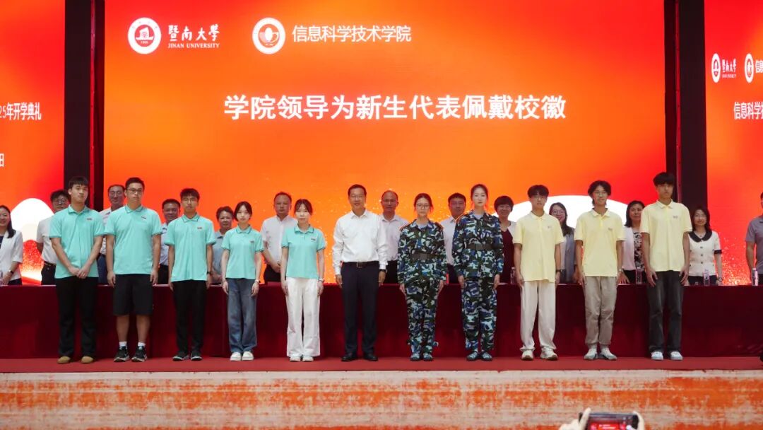 罗国伟为新生代表们佩戴校徽,完成了他们暨南信息学子独有的身份认证。这枚校徽承载着师长们的期许,是身份的象征,更是责任的传承。