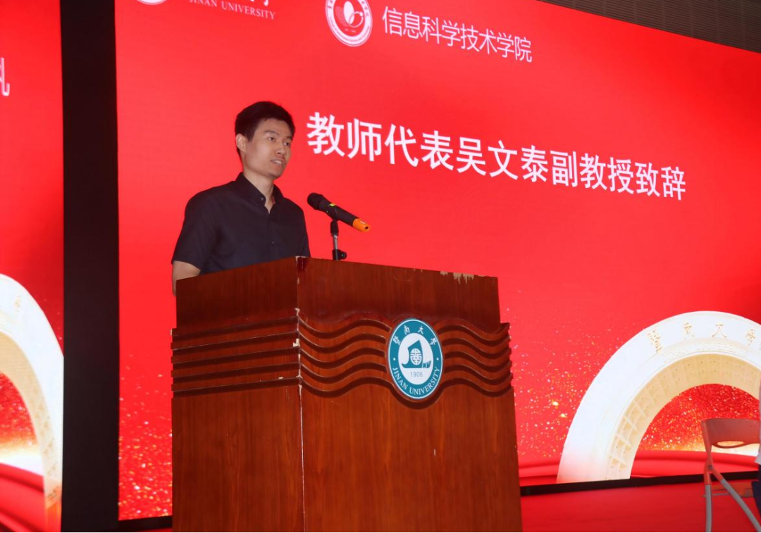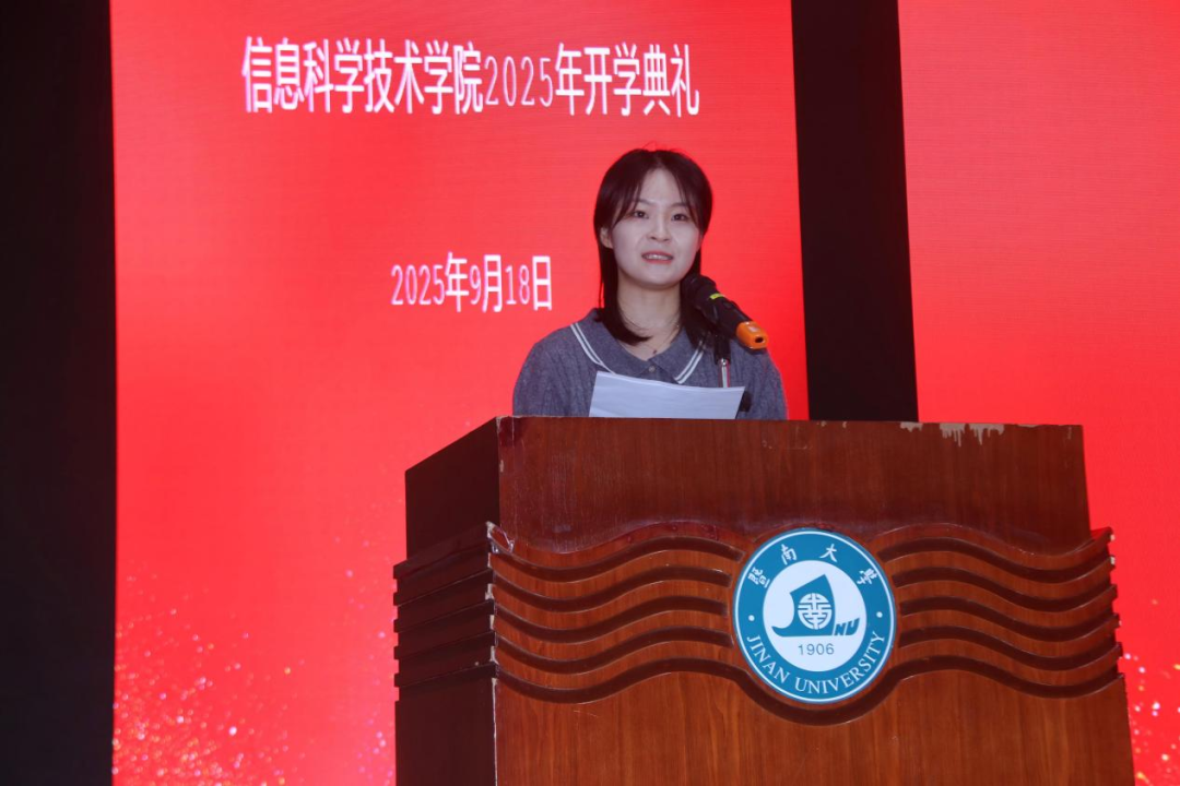 李哲涛再次向957名博士、硕士和本科新同学的到来表示热烈的欢迎。他指出当今世界正处在科技变革和产业升级的百年未有之大变局,向新生提出四点期望:一是心怀国家,锚定方向,做红专并进的信息人,牢记传播优秀传统文化的嘱托,将专业选择与国家需求结合;二是深耕专业,追求卓越,做脚踏实地的信息人,学会将知识转化为能力,让专业实力成为未来发展的根基;三是跨界融合、勇于创新,做与时俱进的信息人,积极参与跨学科项目,主动融入人机协同、跨界融合、共创分享的智能时代;四是文武兼修、全面发展,做活力满满的信息人,在体育、文艺、阅读、实践中锤炼自我,弘扬暨南精神。