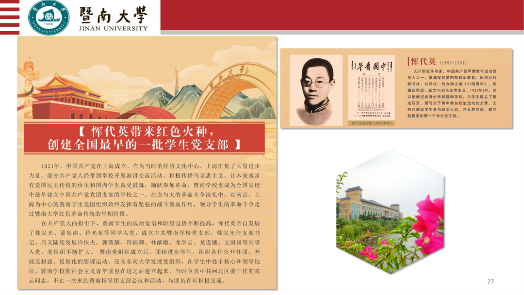最后以 “与党同心的暨南历史” 为脉络,从早期学生党支部建立、马克思主义传播,到师生投身抗日救国,再到叶剑英、廖承志等党和国家领导人助力学校复办,生动展现了学校始终与党同向同行的红色基因,勉励同学们筑牢理想信念,厚植家国情怀。