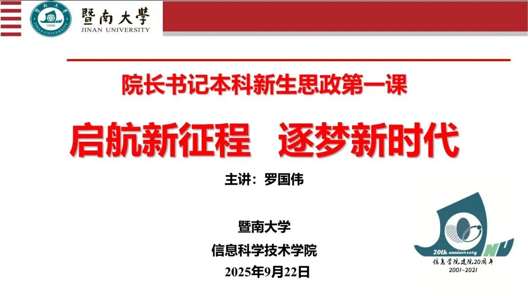 为了加强本科新生的思想引领,引导同学们践行新时代青年使命,牢固树立 “爱国爱校” 情怀,9 月 22 日上午,信息科学技术学院党委书记罗国伟以 “启航新征程,逐梦新时代” 为题讲授思政第一课。学院党委副书记张艳丽、学工办全体辅导员、学长代表及670余名本科新生参加活动,本次讲座由学院学工办主任江秀海主持。