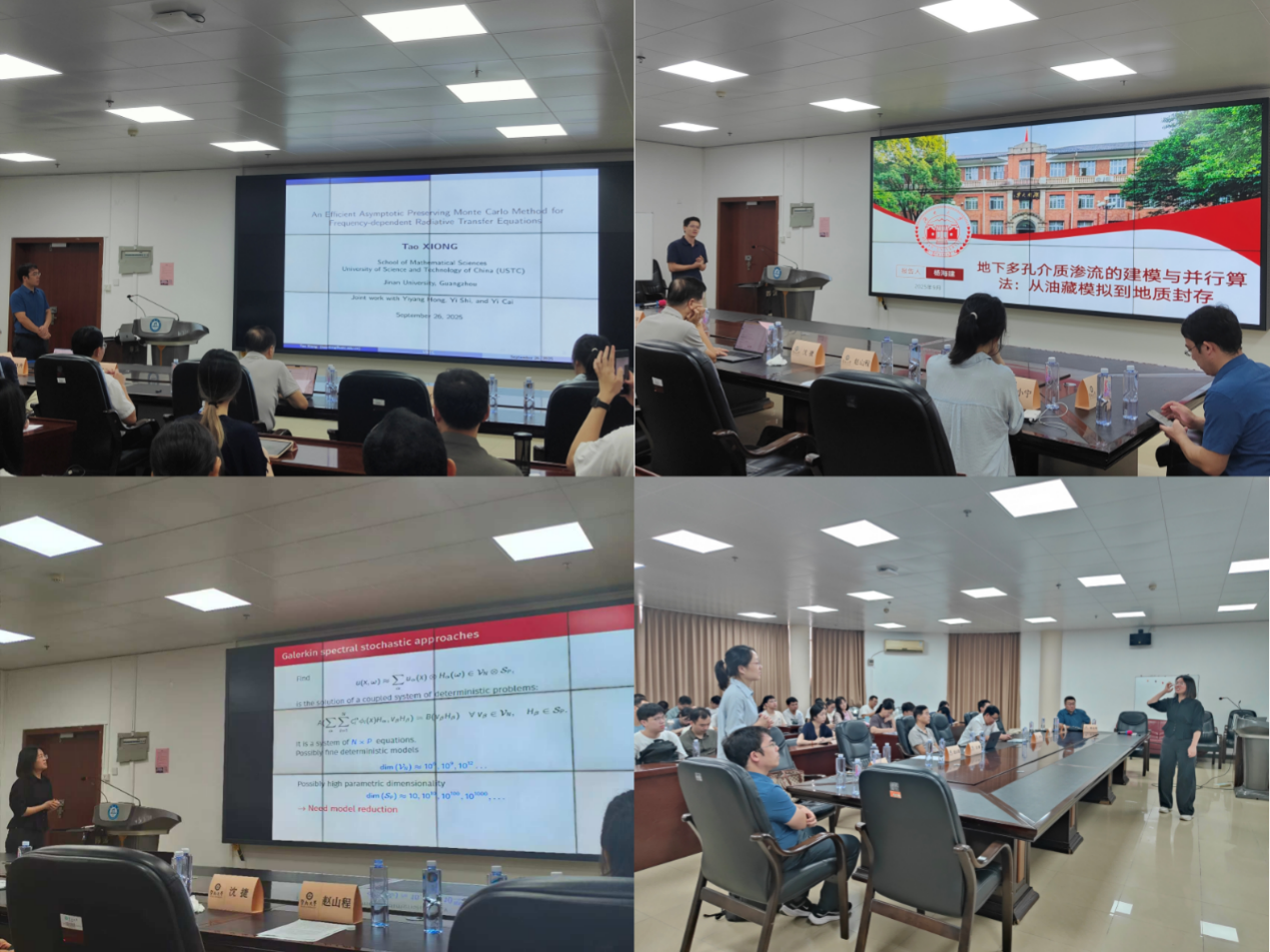 熊涛介绍了一种基于特征线的渐近保持算法,结合蒙特卡罗方法实现求解辐射传输方程大步长高效计算,可用于核能和等离子体工程、航空航天热管理以及光学和遥感系统模拟。 杨海建介绍了针对复杂地质条件的多相流数学建模与并行计算方法,其成果在油气藏开发中可显著提升资源采收率并降低环境扰动,在国家碳中和战略背景下,此类技术对碳封存地质体密封性评估尤为关键。李秋齐介绍了低秩近似与变量分离方法在随机偏微分方程中的应用,可显著提升高维问题的计算效率与可扩展性。