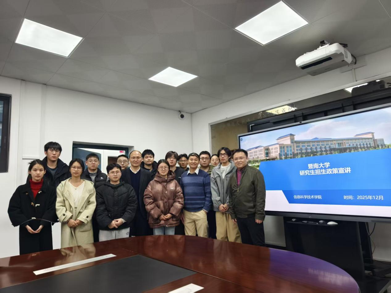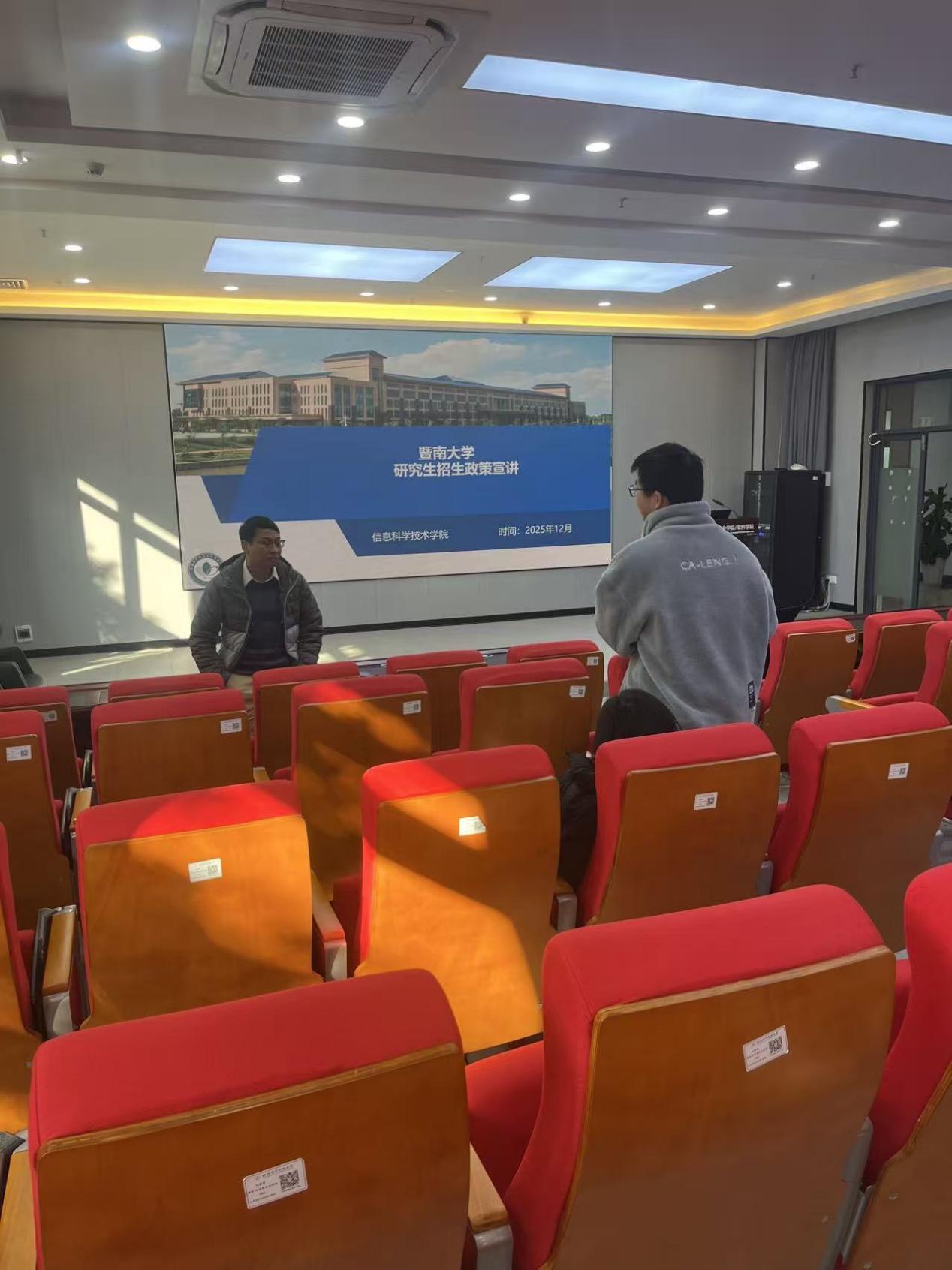 为进一步提升研究生生源质量,精准对接优质生源需求,深化校际学科交流与合作,12月6日-7日,暨南大学信息科学技术学院招生宣传工作组赴广西师范大学、桂林电子科技大学开展研究生招生专场宣讲活动。工作组由学院李哲涛院长带队,携研究生导师、研管办工作人员组成,通过座谈交流、政策宣讲、互动答疑等多种形式,向两校学子全面展现信息科学技术学院学科实力与育人优势,搭建起优质生源输送与学术交流的桥梁。