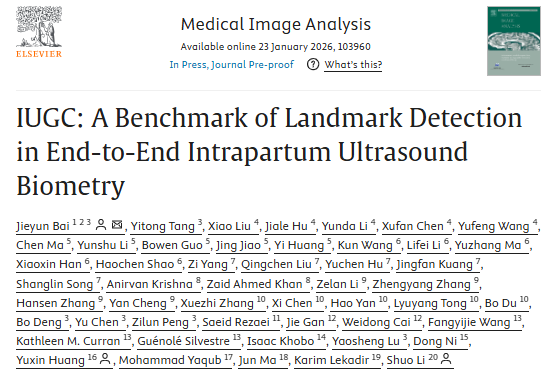 近日,由暨南大学信息科学技术学院、暨南大学第一附属医院(华侨医院)联合奥克兰大学、悉尼大学、巴塞罗那大学、都柏林大学、开普敦大学、穆罕默德·本·扎耶德人工智能大学、多伦多大学等全球20余家高校与医疗机构共同组织的MICCAI IUGC 2025(Intrapartum Ultrasound Grand Challenge)官方荟萃论文,在医学影像领域国际权威期刊Medical Image Analysis上发表。论文题为“IUGC: A Benchmark of Landmark Detection in End-to-End Intrapartum Ultrasound Biometry”,系统构建了首个面向产时超声关键点检测与分娩进程参数自动测量的开放基准体系,为智能分娩监测与产程管理提供了标准化评测平台与开源资源支持。