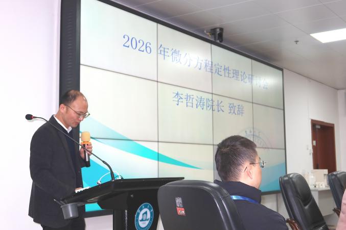 1月22日,会议在暨南大学南海楼338会议室正式开幕。信息科学技术学院李哲涛院长、罗国伟书记、数学系褚志娟书记、崔金涛副主任等院系领导出席了本次会议。开幕式上,李哲涛院长作为领导代表向远道而来的专家学者表示最诚挚的欢迎与感谢。他在致辞中指出,学院一直高度重视包括微分方程在内的基础数学研究,将其视为学科发展的基石和创新源泉。他强调,微分方程作为连接理论与应用的关键桥梁,其定性理论的研究深度直接影响着相关学科的发展高度。本次研讨会汇聚了该领域内的众多杰出学者,不仅将为微分方程定性理论的前沿探索注入强劲动力,更将对我院学科建设的高质量推进、科研创新能力的持续提升以及青年人才的培养,产生积极而深远的影响。
