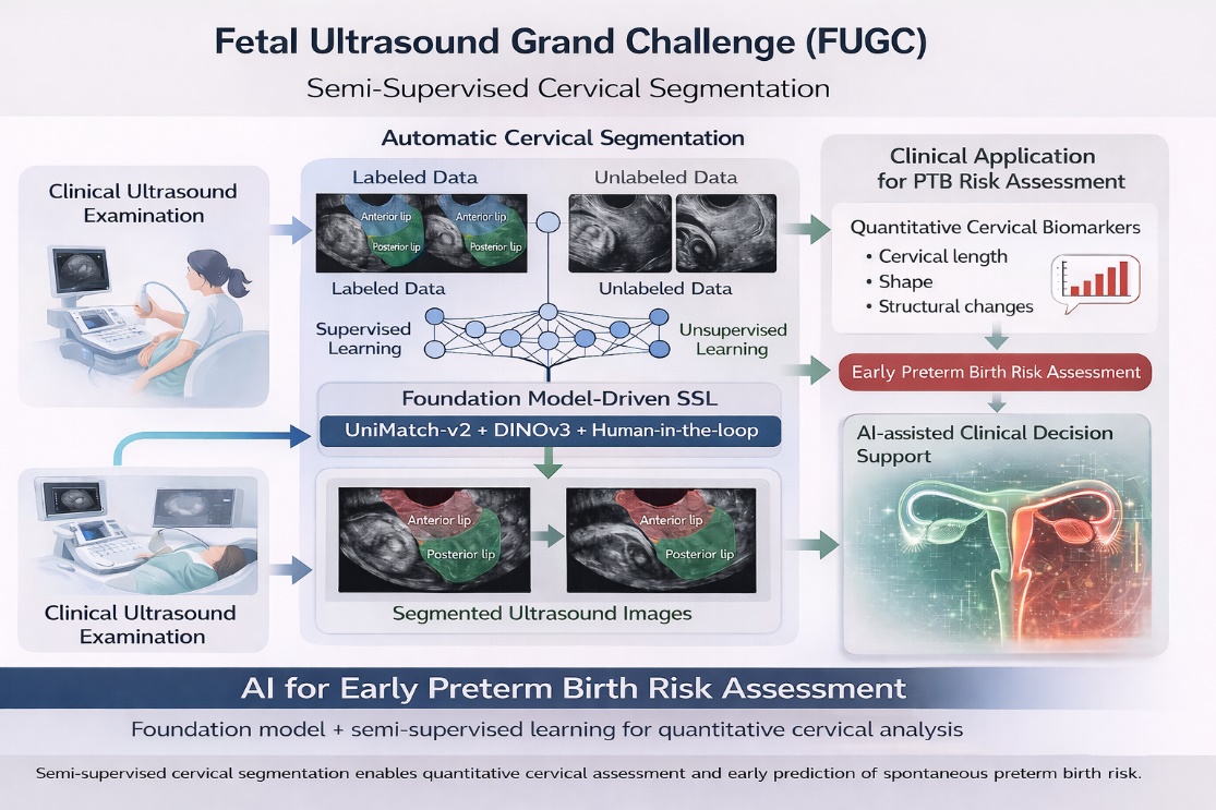 近日,暨南大学信息科学技术学院、暨南大学第一附属医院(华侨医院)、南方医科大学珠江医院,联合全球多所高校与科研机构完成的最新研究成果《FUGC: Benchmarking Semi-Supervised Learning Methods for Cervical Segmentation》在医学影像领域国际权威期刊《IEEE Transactions on Medical Imaging》发表。该研究构建了全球首个面向宫颈分割的半监督学习基准挑战赛(FUGC),建立了标准化的数据集与评估体系,有效破解了经阴道超声(TVS)宫颈分割中标注数据稀缺、评估标准缺失的行业痛点,为人工智能辅助早产(PTB)风险早期筛查提供了全新技术路径,推动围产保健AI技术向数据高效利用方向稳步发展。白杰云副教授和黄郁馨副主任医师为共同通讯作者。