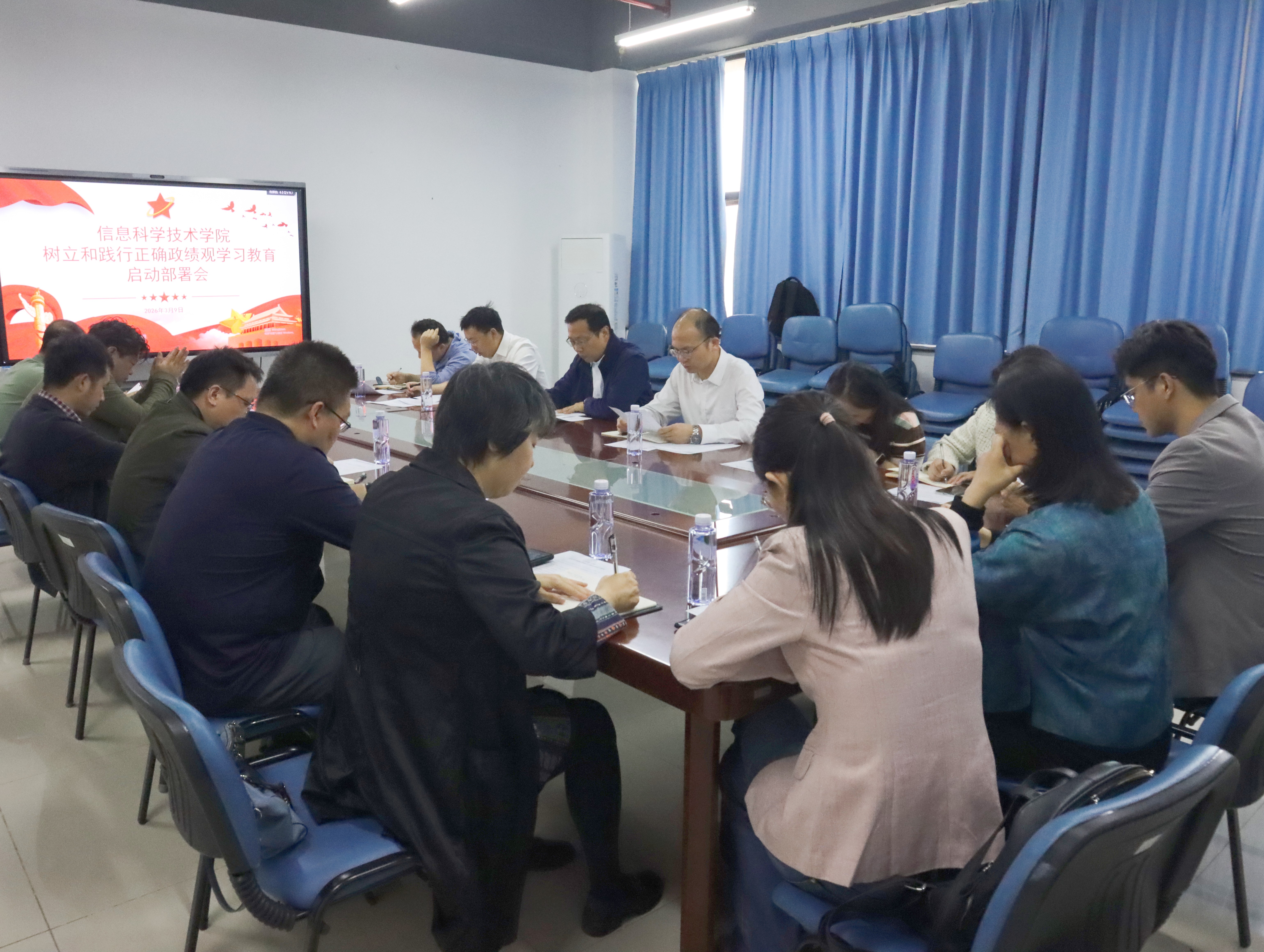 2026年3月9日上午,信息科学技术学院在学院1420会议室召开树立和践行正确政绩观学习教育启动部署会议,学院领导班子成员、三办主任、各系(中心)党政负责人及学院全体中层干部参加会议。会议由学院党委书记罗国伟主持。