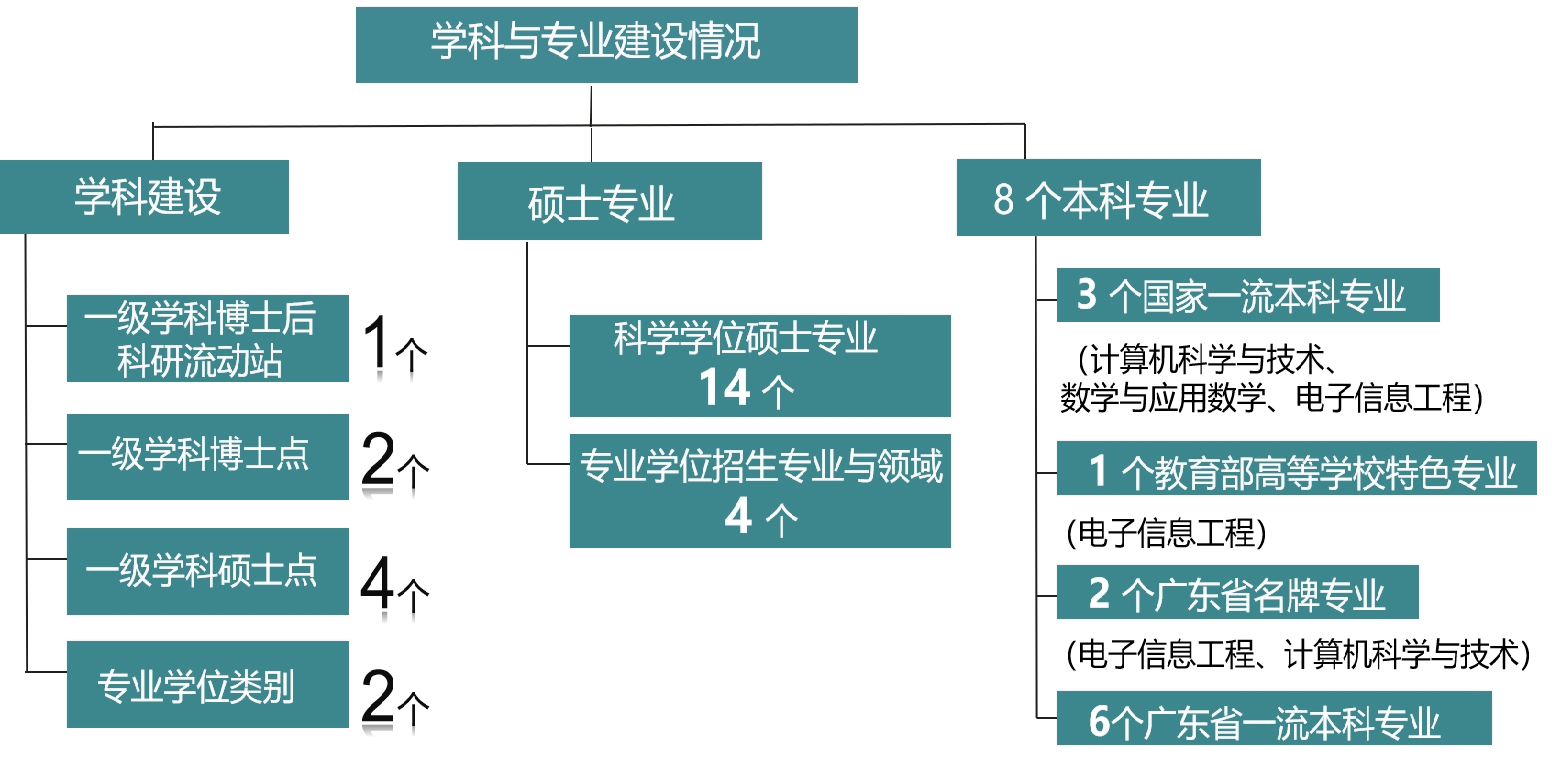 二十余年来,学院始终秉承暨南大学“忠信笃敬”的校训和“开拓进取、锐意创新”的办学精神,这一传统成为学院持续发展的力量源泉,激励着一代代信息人不忘初心、团结奋进、励精图治、乘势而上。学院拥有计算机科学与技术、数学2个博士学位授权一级学科,4个硕士学位授权一级学科,并设有计算机科学与技术博士后科研流动站。此外,学院与管理学院共建管理科学与工程博士点,与经济学院共建概率与数理统计硕士点,形成多学科交叉支撑的体系。学院现有14个科学学位硕士专业,4个专业学位招生领域,本科专业8个,其中包括3个国家级一流本科专业建设点、1个教育部高等学校特色专业、2个广东省名牌专业以及6个广东省一流本科专业。