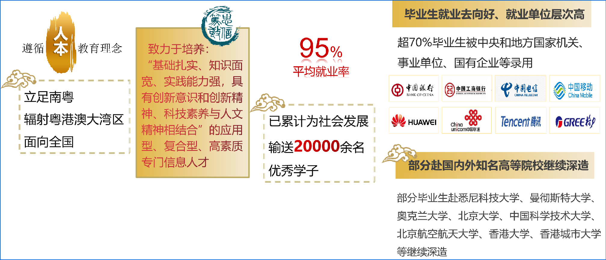 学院高度重视就业工作,将毕业生就业率、就业指导服务、大学生实习基地建设以及职业生涯规划教育列为重点工作内容。具体举措包括:一是开设《职业生涯规划》《创新与创意》等课程,并举办多场职业规划讲座,以增强学生与专业领域的契合度;二是遴选优质企事业单位,组织招聘活动,并通过与学生深入交流,引导其确立合理的职业定位;三是积极与企业协商共建合作平台,拓展就业市场,例如成立暨南大学广东浪潮大数据研究院、东软睿道实习教学研究基地、暨南大学—H3C网络技术实践教学基地、暨南大学–广州腾科网络技术有限公司大学生实践教学基地、以及华为信息与网络技术学院创新人才中心等多个校企合作平台。